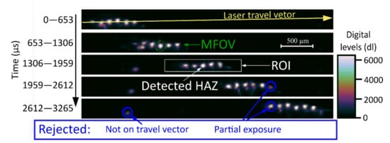 The build laser is a pulsed system. Each exposure of the laser creates a distinct HAZ in the scene. Multiple HAZs are imaged within a single exposure of the camera, forming a straight line of hot spots on the laser travel vector. An automated HAZ detection algorithm was developed to identify the HAZs that met the detection criteria. The method involved a 29 × 195 pixel Region of Interest (ROI) that was cropped within the image and added to a historical database of ROIs for each video frame. Figure 4 shows the ROI detection process. The algorithm searched for regions of high signal level within an image and used the measured laser travel vector to reject ejected particles and other anomalous readings.