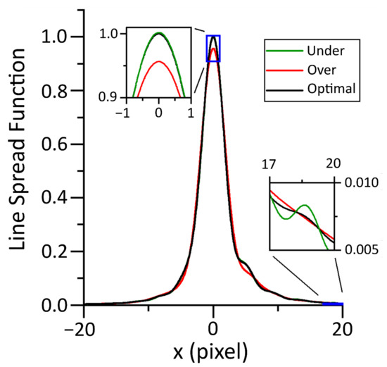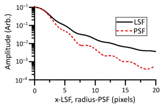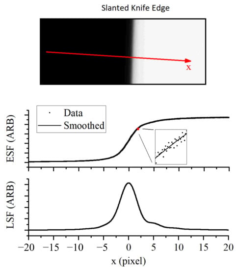 The PSF is a representation of the spatial transfer function, which determines the magnitude and character of blur in the imaging system. The slanted knife edge method [,,] is an established characterization technique for imaging devices. Images of a slanted knife edge were used to ascertain the one-dimensional Edge Spread Function (ESF) as a function of perpendicular distance from the knife edge at a sample frequency of 100 points per pixel. The Line Spread Function (LSF) is the spatial derivative of the ESF: