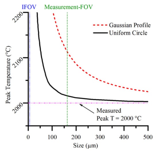 The peak temperature (measured by the direct method) could be generated by any distribution from within a broad class of thermal distributions. Figure 8 illustrates the relation between size and temperature that would give identical measured peak temperatures for two forms of thermal distribution. For nonuniform (Gaussian) temperature distributions, the size effects the measured temperature even when the size of the distribution is significantly larger than the Measurement FOV. The data in Figure 8 were generated by convolution of a series of rotationally symmetric scenes with the PSF of the instrument. The search algorithm ‘fminbnd’ in MATLAB was used to find the peak temperature that gave a measured peak temperature of 2000 °C at the central pixel, for each scene size.