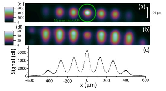 The characterization data presented in Figure 10 show that the width of the LSF is several pixels, indicating that the system is oversampled. Oversampling in this context means that the spatial Nyquist frequency of the sensor is higher than the frequency of the cutoff MTF of the system. A cutoff MTF of 0.99 is used as suggested by a related metric in the literature []. The cutoff frequency for our instrument was found to be 0.009 pixels. The MTF was calculated by Fourier transform of the measured PSF. The Measurement FOV was measured by the method described in Section 3.2 to be a circle of 163 µm diameter.