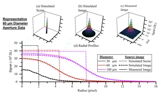 Figure 11 presents representative data considering the performance of the reconstruction technique when applied to the validation targets. The plots in Figure 11a,b show the simulated scene and simulated image generated from the best fit model parameters. The close alignment in the radial profiles of the simulated and measured images in Figure 11d demonstrates the validity of the characterization methodology. The discrepancy for the larger-diameter apertures can be partly explained by the inherent weighting of the perimeter of the scene. The amount of data on the perimeter scales with the radius of the target meaning the central plateau is weighted relatively less for the larger-diameter targets. A perfectly functioning reconstruction technique would generate thermal fields, and hence simulated scenes, with identical temperatures. Figure 11d illustrates the two extremes of aperture sizes where the technique is working as we anticipated.