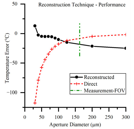Validation of the reconstruction technique is required to give confidence that the reconstructed thermal field is closer to the true thermal field than that measured by the direct method. We can see from the results that the reconstruction technique performs well in the 30–100 µm aperture size. Above this size, the direct method performs sufficiently well without the need for a reconstruction technique to be applied.