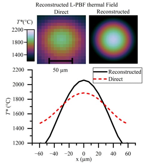 The measured thermal fields in Figure 13 illustrate the significant difference between the direct method and the reconstruction technique that has been articulated throughout this paper. The technique makes a 174 °C difference to the peak measured . The spatial thermal gradients are significantly higher than would be inferred from the direct method. This is important because the solidification rate is proportionate to the thermal gradient. It is a limitation of this work that the infrared images cannot be considered temporally resolved, making truly quantitative measurements of temperature beyond the scope of this work. The same methodology applies to any other thermographic applications where the feature sizes are small compared with the optical resolution of the instrument.