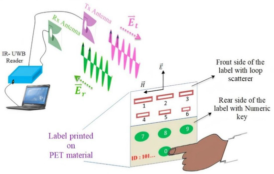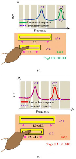 In today’s era of IoT devices, humans have been continuously interacting with the devices like no other time before. The IoT trend also fueled the researchers to find a way to interact the devices wirelessly in a cost-effective manner. Since the past decade, the RFID technology has started to put its footprint in the form of human gesture recognition sensor to interact with various devices. Thorough research has been conducted to find the effects of human body interaction on RFID devices [3] and the impact in the real-life scenario is also studied [4,5,6,7]. In this context, it becomes of great interest to show that a chipless tag, in addition to being an identification device, can be used as a touch sensor to convey useful information to the reader. In this scenario, resonators initially used for coding information also become the base element for a low-cost user interface directly integrated within the label.