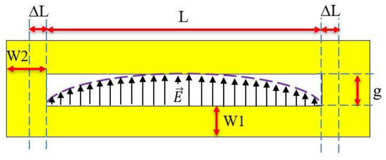 The loop resonators (represented with geometrical parameters in Figure 4) can be modelled as a coplanar stripline of length L with short circuits (SC) at both terminations. At radio frequency, the shorted ends depart from ideal SC due to magnetic energy stored behind the termination. This can be modelled by an additional length ∆L as in [22], and is the total effective length (see Equation (1)). The resonant frequency of the loop is then classically obtained from the study of the resonance equation associated to the equivalent circuit [22] which gives
