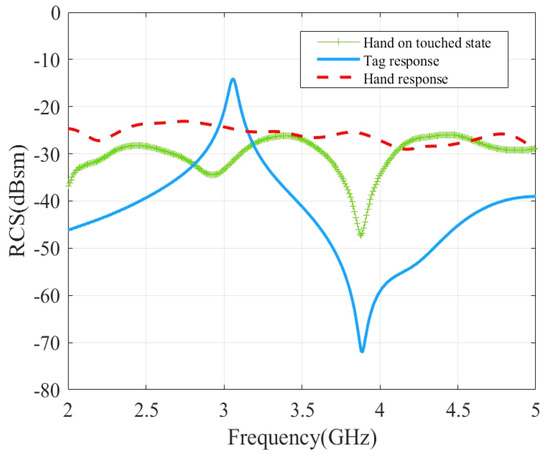 Simulated RCS response of the tag to study the impact of the hand touch event.