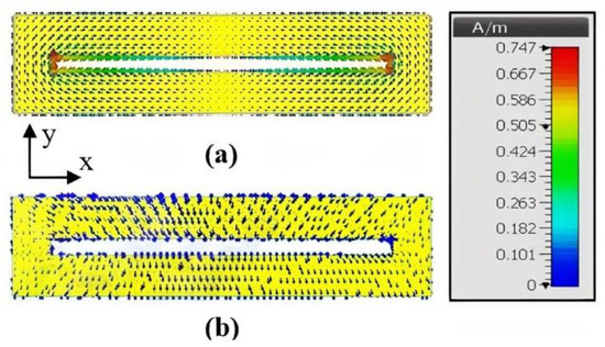 Surface current distribution of the loop scatterer at resonant frequency 3.05 GHz: (a) Scatterer is in untouched state; (b) finger is in contact with the scatterer.