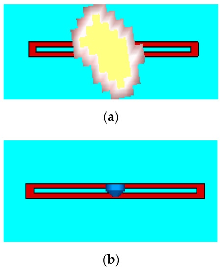 Then, for the third stage, a lumped element was created with the obtained capacitance value C = 0.77 pF) and placed between the coplanar lines (see Figure 8b). The observed backscattered response is also plotted in the Figure 9a (blue curve Figure 9a).