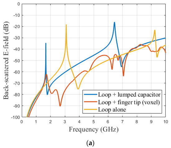 In order to evaluate the performance of the introduced model and to justify the capacitive effect linked to the presence of the finger in contact with the loop, simulations were carried out on CST. Figure 8 shows the case where the fingertip is in contact with the loop (Figure 8a), as well as the case closer to the model (Equation (3)) where a capacitor (lumped element) was introduced in the middle of the loop (Figure 8b). Figure 9a presents the comparison of backscattered E-field from the scatterer at three different situations. The curve corresponding to loop alone (yellow curve in Figure 9a), i.e., without any influence of any external factors was used as the base curve for the comparison.