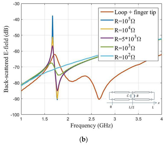 Comparison of backscattered E-field from the loop scatterer at different scenarios. (a) Capacitive effect in relation with Figure 8, (b) Parametric study on the introduction of a resistor R in parallel to consider the attenuation effect due to the presence of the finger.
