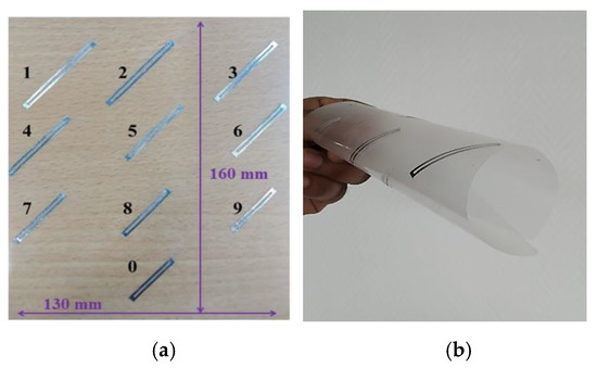 Three labels comprising ten loop scatterers distributed in the band 3 GHz to 5.6 GHz (geometrical lengths are given in Table 1) were realized by cutting aluminum tape (0.1 mm thickness). A slot with g = 1 mm, metallic width W1 = 1 mm, and W2 = 2 mm (Figure 4) were chosen for all resonators to facilitate the realization process. The resonators were then pasted on a thin PET substrate with a dielectric constant εr = 2.6 and a loss tangent tanδ = 0.006 with 100 µm thickness and dimensions of 160 × 130 mm2. The resonators were arranged as represented in Figure 10 (the term digit 10 used in the article for the digit 0 in the Figure 10) to compose a decimal numeric keypad. The scatterers were oriented at 45° to achieve a compact design but were read in co-polarization. Each scatterer corresponded to a decimal digit which is indicated in Figure 10a.