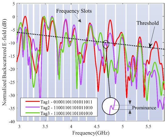 The measurement results of the three tags as well as their respective ID are presented in Figure 12. In real environment, the data were subject to noise and the presence of ripples made decoding difficult. From this example we saw that a strategy must be employed to retrieve the correct code. The first action to be taken was to select peaks based on peak prominences in order to discard secondary peaks (ripples), as represented by the inline of Figure 12. In a second step, a threshold could be applied to select the peaks with a maximum height. The spectral energy distribution of the incoming signal was not uniform such that the threshold had to be chosen to decrease with frequency, as represented in Figure 12. Applying this two-step strategy, the identifiers were well-decoded for the three labels even in the office environment, with a single-layer tag and a low-cost reader. The coding capacity for 10 peaks distributed among 17 frequency slots [32] was given by calculating the total number of combinations, which can be obtained as ; base 2 logarithm of the total combination value will give the bit, which is given in Equation (3).