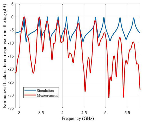 Simulation and measurement comparison of backscattered response from Tag 1 (Figure 12, red curve). Measurements were taken for the chipless reader, as discussed in [21].