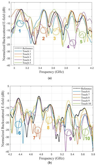 Tag 1 in Figure 12 was used to demonstrate the touch-sensing capability. The measurement setup was the same as the one represented in Figure 11. Each scatterers of the label were touched and corresponding backscattered responses were measured, which is then compared with the un-touched response. For readability, the touch gesture results are presented separately in Figure 14a (resonators n°1 to n°5 from 3.1 GHz to 4.2 GHz) and in Figure 14b (n°6 to n°10, 4.2 GHz to 5.8 GHz). In all cases, the presence of the finger cancelled the appropriate resonance with an average magnitude reduction of 15 dB. The presence of the finger had a non-negligible impact on the neighbouring peaks (increased by +2.34 dB compared to reference for curve touch 4 at 4.1 GHz) but it had a localized effect on the signature and did not undesirably suppress the response of the surrounding resonators. The peaks of the untouched resonators remained clearly visible and were less perturbed than the resonator touched by the finger.
