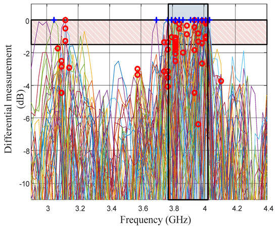 A series of 50 identical measurements were carried out to evaluate the repeatability of the approach. For each sequence, an initial measurement was taken without key pressing and then a second measurement was taken while pressing the digit n°4. The two measurements were then subtracted (relative measurement) which resulted in a maximum at the resonant frequency of resonator n°4. The maximum of the relative measurements (normalized for visibility) are represented in Figure 15. To determine if the detection is valid, the simplest approach was to select the maximum of the differential measurements (blue plus signs in Figure 15, which are discretely distributed due to the 25 MHz frequency resolution of the reader) and to assess that the point is in the frequency slot corresponding to resonator n°4 (3.9 GHz ± 125 MHz). This simple approach provided a read rate of 86% which may be insufficient for real applications. Inspecting the results of the differential measurement showed that, when false detection occurred, a peak was still present in the proper slot (resonator n°4), but a second peak of comparable height also appeared for another frequency, which may be due to the modification of the structural mode (non-resonant contribution of the finger).