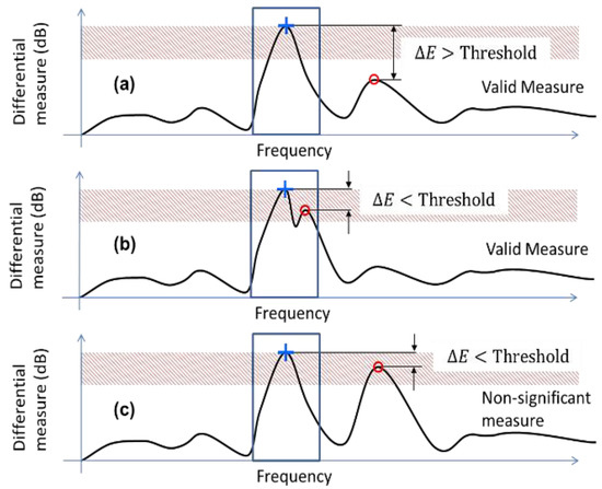 A more robust technique was to select the maximum of the two major peaks (blue plus and red circle sign in Figure 15) and to compare them to see if one was dominant compared to the other. If one peak was dominant, i.e., superior to a threshold value compared to second peak (Figure 16a), the measure was considered valid and the slot corresponding to the resonant frequency was selected. If the two peaks were comparable and are in the same frequency slot (presence of ripples in the vicinity of the main peak), the measure was considered valid and the frequency slot was selected (Figure 16b).