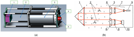 MiniDHC for accompanying measurements: (a) layout, (b) optical scheme. 1—mirror–prism system; 2—measured volume; 3—sealed case; 4—power connector; 5—Ethernet connector; 6—window; 7—beam expander; 8—receiving lens; 9—laser diode; 10—CMOS camera.