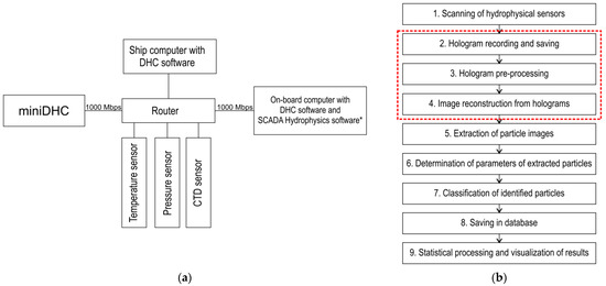 Figure 3b shows the basic DHC software with red dotted line. Blocks 1, 5, 6, 7 may be changed and supplemented. For example, block 1 focuses on a set of available hydrophysical sensors. Blocks 5–7 may be modified and supplemented depending on the problem to be solved [40], for example, by a block for particle size distribution, forming video according to holographic data, determining particle speed, etc.