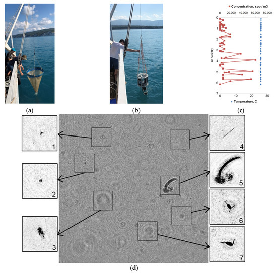 Equipment lowering in the Blue Bay on 25.06.19 from Ashamba research vessel: (a) Traditional plankton fishing using a net; (b) Hydrobiological probe with the miniDHC; (c) Profile of plankton concentrations (red) and one of the hydrophysical parameters (blue-temperature) recorded in situ in the photic layer and in real time. Measurements were made at station No. 1 with coordinates 44°34.3623′ N 37°58.7232′ E. (d) Digital hologram recorded at a depth of 1.8 m and reconstructed particle images: 1, 2—Suspension; 3—Marine snow; 4—Phytoplankton chain; 5—Copelata; 6, 7—Copepoda.