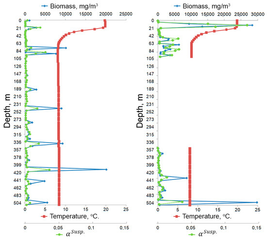 Example of background data represented by depth profiles. Sailing of Ashamba research vessel to the Black Sea on 16 October 2019, station No. 6 with coordinates 44°31.2398′ N 37°54.3828′ E, submersion up to 500 m: green graph—average turbidity-total fraction of the sectional area volume shielded by particle sections associated with the suspension taxon (); red—water temperature; blue—average biomass of particles. (a) In forward motion (submersion); (b) In backward motion (lifting), in key areas.