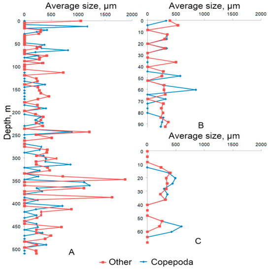 Average particle size by stations: (A) Station No. 6 with submersion up to 500 m and geographical coordinates 44°31.2398′ N 37°54.3828′ E; (B) Station No. 5 with submersion up to 100 m and coordinates 44°32.0743′ N 37°55.3762′ E; (C) Station No. 4 with submersion up to 70 m and coordinates 44°32.1922′ N 37°56.0360′ E.