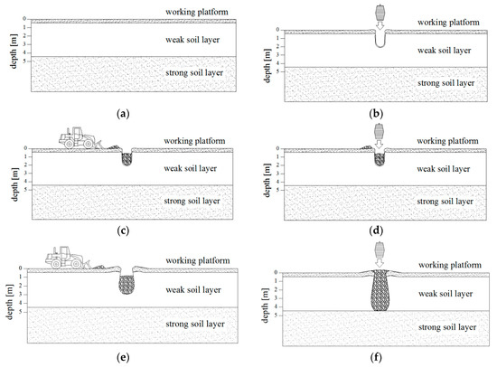 Process of dynamic replacement column formation: (a) construction of working platform, (b) drop of tamper and crater creation, (c) crater backfill and (d,e) drop of tamper and crater backfill, (f) dynamic replacement column.