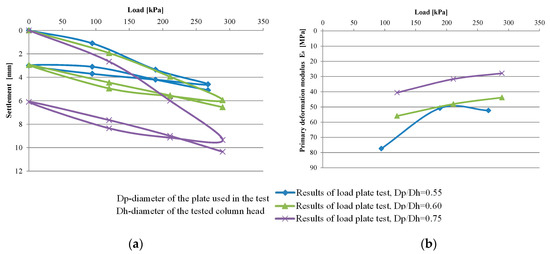 Results of load plate tests [10]: (a) load–settlement relationship and (b) values of primary deformation modulus.