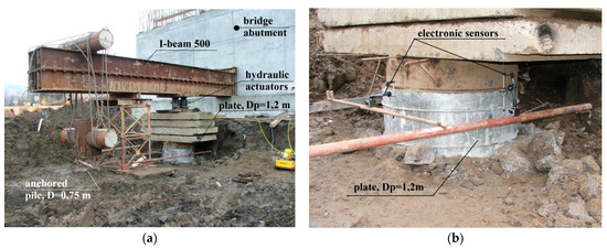 For tests of up to several hundred kilopascals (e.g., 0–300 kPa), the loading plate is placed on the compacted and leveled head of the column, and the loading is carried out by crane-locked actuators used for ground improvement. Settlement is measured by using three or four mechanical or electronic sensors supported by independent steel frames spaced evenly around the slab. The tests are carried out by using the method of constant load steps, with the adopted value of stabilization of settlements, including the range of primary and secondary pressures. This concept is used in daily acceptance practice.