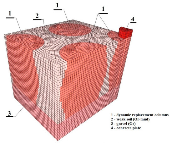 FEM computational analysis concerning the issue of strengthening cohesive (organic) soils with granular material (dynamic replacement columns) suggests the use of specific constitutive soil models in the computational analysis. In the case of granular soils forming both the column and the underlying soil layer (gravel with the addition of pebbles), characterized by low compressibility, the elastic–perfectly plastic model with a Coulomb–Mohr yield surface and non-associated flow rule can be successfully applied. During column loading, plastic deformation will dominate in large areas of weak soil; hence, the models justified for these soils are those with plastic strengthening and weakening combined with porosity changes. This prefers critical state models, particularly the well-known and implemented Modified Cam-Clay model in FEM programs.