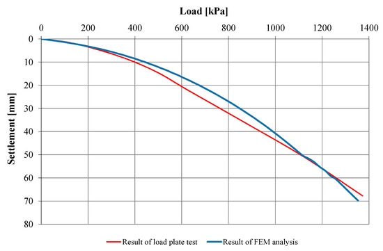 FEM analysis made it possible to determine the parameters of the model simulating the work of columns, i.e., E = 60 MPa, ϕ = 46°, c = 5 kPa, ψ = 20°, for which the modified coefficient of determination was 0.989. Small value of column cohesion is probably due to the interlocking of column particles (made from crushed sandstone) phenomenon [20]. The results of the back analysis, along with the bearing capacity study, are shown in Figure 5.