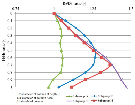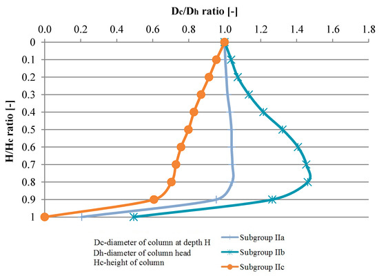 For the end bearing columns in Group I, the columns’ shapes and diameters were primarily determined by the depth of the strengthened soil. In this group, the columns had fixed diameters along their length (Subgroup Ia), with maximum diameters at the base (Ib), at the mid-length point (Ic) and at the column bottom part (Id), respectively. For the floating columns, three specific column shapes were identified: cylindrical (Subgroup IIa), wide-base (Subgroup IIb) and wide-head (Subgroup IIc).