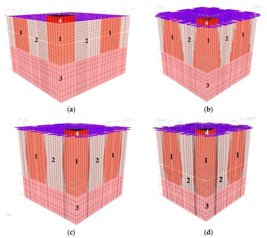 Discrete models of ground improved by dynamic replacement—Subgroup I, L = 2Dh: (a) Ia, (b) Ib, (c) Ic and (d) Id.