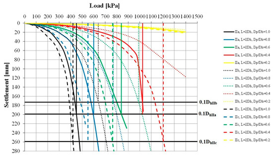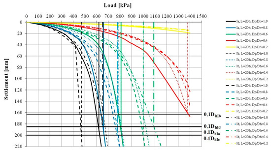 The shape of the columns also affects the obtained limit stress. Among all the subgroups, the columns with diameters widening with depth (Subgroups Ib, Id and IIb) were characterized by the highest bearing capacity, while those with diameters decreasing with depth (IIc) with the lowest (Table 4). These differences are significant for plates meeting the condition Dp/Dh ≥ 0.6; they reach 40–60%. It is worth noting that, despite the fact that the columns of Subgroup IIb were floated, they had a bearing capacity similar to that of the columns founded on the bearing layer. For plates with diameters satisfying the condition Dp/Dh ≤ 0.4, high surface pressures (>1400 kPa) are necessary to obtain limit stress.