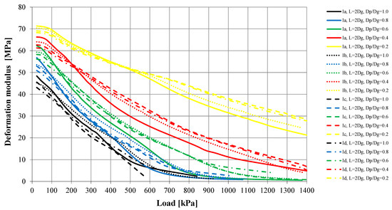 The value of the settlements is strongly influenced, first of all, by the shape of columns and their underlying layer; however, this depends on the diameter of the plates used. In the case of the smallest plates (Dp/Dh = 0.2), the differences in settlements between individual column subgroups range from 36% (Group I) to 48% (Group II). For larger plates (Dp/Dh ≥ 0.4), in the case of end bearing columns, the smallest settlements were obtained for the columns with the largest diameters in the lower parts of the columns (Subgroups Ib and Id), and the largest for the columns with the maximum diameter in the central part of the column (Ic) or with a constant diameter (Ia)—in this case, the differences in settlements were over 250% (e.g., for Dp/Dh = 0.6). Similar behaviors were observed in the case of the floating columns—the smallest settlements were obtained when the diameter of the columns increased with depth (Subgroup IIb), and the largest in the opposite situation (Subgroup IIc). For this subgroup of columns, the differences in settlements reach approximately 450% (e.g., for Dp/Dh = 1.0). These differences are translated into calculated deformation moduli (Figure 12 and Figure 13). When using plates with the same Dp/Dh ratio, the differences may be up to 250% (e.g., for q = 400 kPa, Subgroups IIc and IIb, Dp/Dh = 1.0).