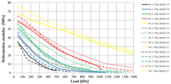 The load–settlement relationship was determined for each model (Figure 10 and Figure 11). They formed the basis for determining the bearing capacity of the columns (Table 4) and the deformation modules of the strengthened soil (Figure 12 and Figure 13) according to Formula (1). According to Florkiewicz et al. [21], the bearing capacity of the columns was assumed to be equal to the load-causing settlement, equal to 10% of the diameter of their head. Results are presented for models in which the columns were formed at a spacing of two column-head diameters (L = 2Dh). For clarity of the graphs, different line styles (e.g., continuous, dashed, etc.) were adopted for particular subgroups of columns (Ia–IIc) and the colors of curves selected so that, as the Dp/Dh ratios decrease, the relationships are presented in increasingly lighter colors (from black to yellow).