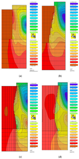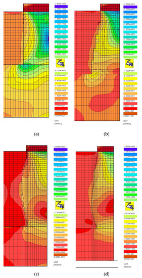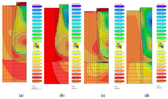 Maps of total stress, q = 400 kPa, Dp/Dh = 1.0: (a) horizontal, Subgroup IIb; (b) vertical, Subgroup IIb; (c) horizontal, Subgroup IIc; (d) vertical, Subgroup IIc.