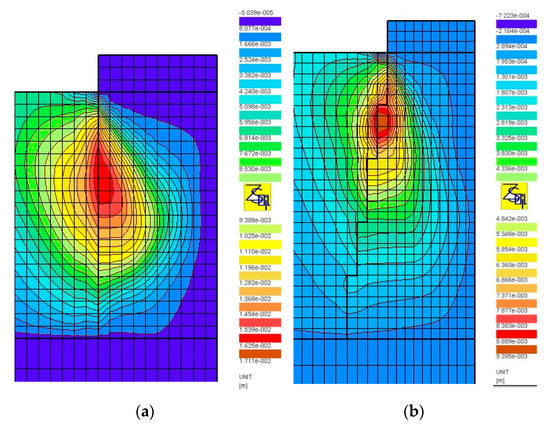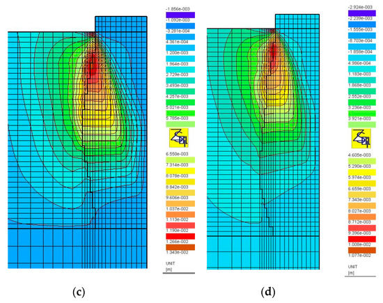 Maps of horizontal displacement, q = 400 kPa, Dp/Dh = 1.0: (a) Subgroups Ia, (b) Ib, (c) Ic and (d) Id.