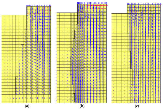 In the case of a column of Subgroup Ib (Figure 18a), right at its side, the direction of the major component of the principal stress is parallel to it. The minor component has a small value. In the case of a column of Subgroup Ic, such a situation occurs only in the upper part of the column (Figure 18b), near the maximum diameter and below which there are already two components of principal stresses, i.e., vertical and horizontal (Figure 18b), with similar values. For columns of Subgroup IIc, the principal stress components are arranged along the entire length of the column side surface in the vertical and horizontal directions (Figure 18c) and have similar values. For columns of Subgroups Ic and IIc, this stress distribution increases the settlement of the column under the load test.