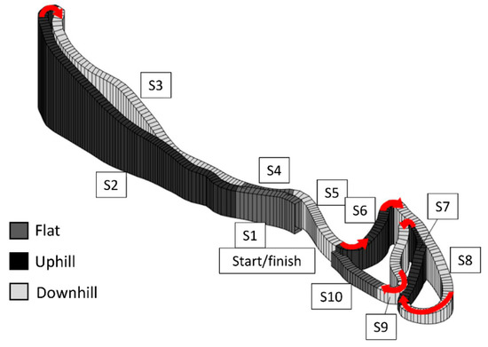 The 2.5 km XC skiing race course divided into the 10 segments according to the elevation difference, including three uphill, three flat, and four downhill segments. Six turns were distributed over the 2.5 km lap (red arrow). With different placement of the start and finish, there is a gap in the 2.5 km course, which was removed from the analyses. (S) Segment (length (meter), incline range (%)); S1: 131 m, −2.6–1.6%; S2: 543 m, 1.7–12.4%; S3: 509 m, −11.7–0.2%; S4 100 m, 0.7–2.8%; S5: 156 m, −6.0–0.0%; S6: 166 m, 1.3–12.7%; S7: 339 m, −8.5–−0.4%; S8: 200 m, 1.2–16%; S9: 183 m, −10.1–−1.0%; S10: 138 m, 0.0–1.6%.