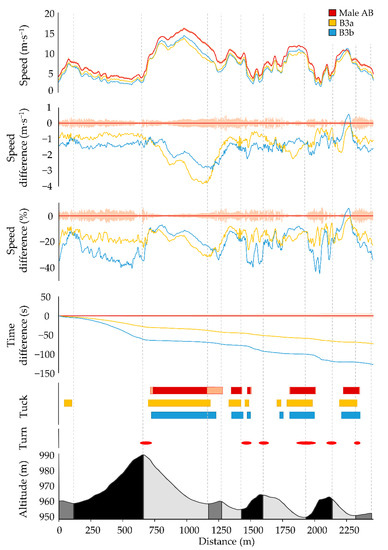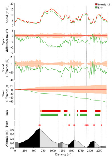 Data of speed and time were interpolated by distance for each lap for both Para and AB XC skiers. Further, the average speed and time over the four or six laps were calculated and used in the analyses. In order to compare Para and AB XC skiers, average values of speed and time were calculated for each group of female and male AB XC skiers. Furthermore, the continuous speed and time differences between the male Para and male AB XC skiers and between the female Para and female AB XC skiers were calculated. The proportion of time in the different terrains was calculated for each Para XC skier, the female, and the male AB XC skiers (mean ± standard deviation (SD)).