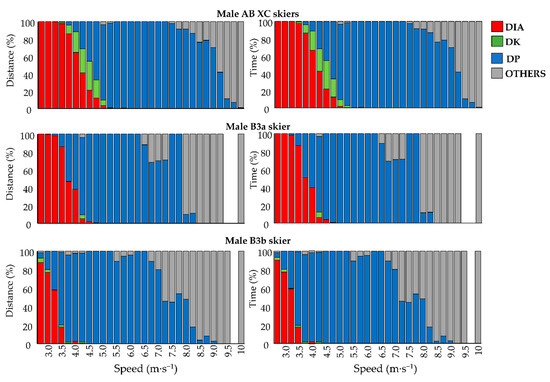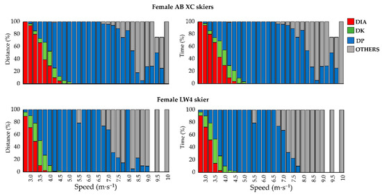The female Para/AB XC skiers utilized on average DP, DK, DIA, and OTHER, 61/43%, 15/10%, 25/47%, and 0/0% of the distance at lower speed ranges (i.e., 2.75 to 4.75 m·s−1), respectively, while the corresponding numbers for male Para/AB XC skiers were 58/18%, 1/13%, 40/69%, and 1/0%. The female Para/AB XC skiers utilized on average DP and OTHER (i.e., tuck position), 26/52% and 74/48% of the distance at higher speed ranges (i.e., 7 to 10 m·s−1), respectively, while the corresponding numbers for male Para/AB XC skiers were 29/66% and 71/34% (Figure 4 and Figure 5).