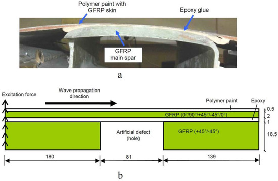 The cross-section image of the sample of WTB is shown in Figure 1a. The most possible place for the appearance of disbond-type defects is between the epoxy adhesive layer and main spar and covering skin. It was not possible to manufacture a disbond-type defect in the real sample. Hence, the hole in the main spar was milled through the whole thickness of the main spar up to the epoxy adhesive layer.