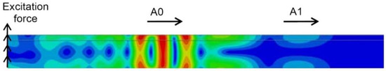 Modulus of the displacement fields of propagating guided waves in the defect-free sample at 100 µs is presented in Figure 3. The obtained B-scan image of the normal component of the wave and 2D Fourier transform images are presented in Figure 4a,b, respectively. The propagation of the A0 mode can be easily observed at 43 kHz excitation frequency. The displacement field of the A0 mode is symmetrically distributed through the thickness of the object under investigation. The propagation of the higher-order A1 mode with higher phase velocity is also visible in Figure 3 and Figure 4a,b. After analysing the displacement field and the calculated dispersion curves with 2D FFT image (Figure 4b), it can be easily observed that the fast wave is the A1 mode.