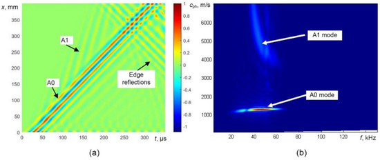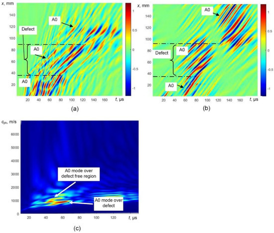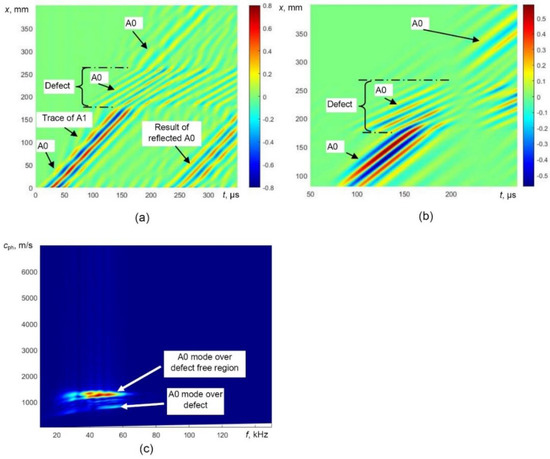 The simulated B-scan image of the defective sample (Figure 6a) was processed by filtering out reflections from the edges of the defect and the selective extraction of the only A0 mode was performed. The processed simulated B-scan image with filtered out reflections is presented in Figure 8a. In this image, the trace of A1 is still visible. The B-scan image after removing the trace of A1 mode is presented in Figure 8b. The phase velocity dispersion curves (over defect-free and defective regions) of only A0 mode reconstructed by 2D FFT of the processed B-scans are presented in Figure 8c.