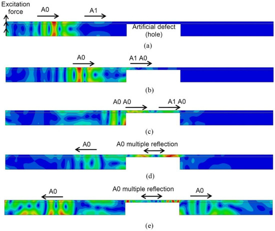 Simulated propagation of UGW in the defective sample by FE, displacement field modulus at different instants of time: 80 µs (a), 110 µs (b), 150 µs (c), 180 µs (d), 220 µs (e).