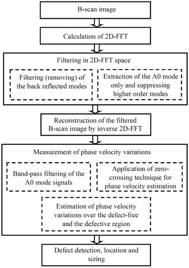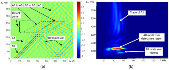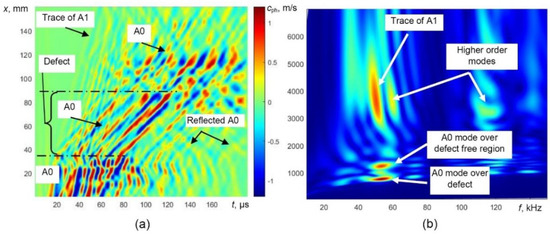Therefore, the most reliable parameter for the indication of the presence of the defect is the variation of guided wave velocity. One of the techniques for the evaluation of phase velocity can be the 2D Fourier transform. The 2D FFT images obtained from the presented B-scan data in the case of a defect are shown in Figure 6b. The propagation of the A0 mode over the defect-free region and defective region and trace of the A1 mode is easily visible.