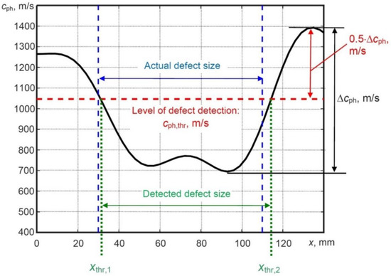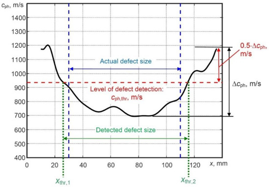 As mentioned above, a halved signal amplitude in NDT usually indicates the location of the defect (e.g., level of 0.5 or −6 dB), therefore, the multiplier coefficient of 0.5 is used for the phase velocity threshold calculation. The application of the proposed phase velocity variations technique based on a new criterion for detection, location and sizing of the defect in the case of the simulated model is shown in Figure 10.