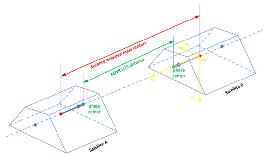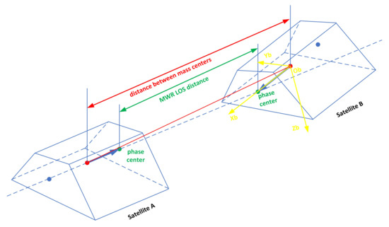 According to MWR and attitude measurement data, the LOS distance between leader-follower satellite antenna centers is transformed into the distance between mass centers. The distance transformation error from antenna phase center to centroid is related to the stability of antenna phase center, centroid stability, MWR Boresight (the MWR LOS that is the vector from the satellite centroid to the phase center of MWR antenna) installation accuracy within X-axis of satellite coordinate system, the attitude measurement accuracy, and the distance stability between the antenna phase center and the centroid. The principle of distance transformation is shown in Figure 1 and Figure 2.