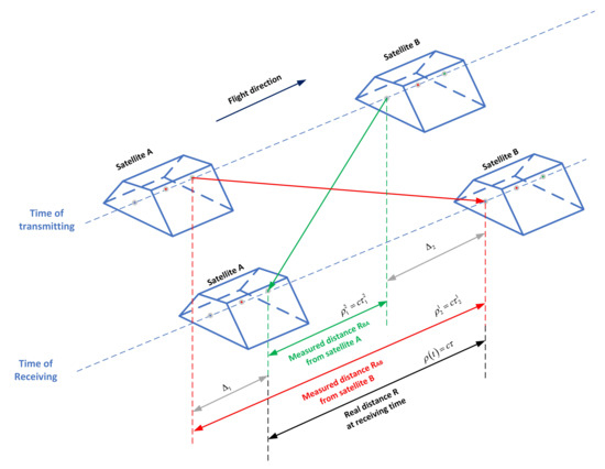 - Instant distance correction error. The distance between two formation satellites is constantly changing during the DOWR process. Assuming that we have the ideal situation of an accurately synchronized MWR system, the receiving time of the two satellites at the end ranging time is accurately synchronized. However, the inter-satellite distance obtained by satellite A at the receiving time and the inter-satellite distance obtained by satellite B at the same time are different from each other, because the satellite moves at a high speed (about 7.8 km/s for 500 km orbit altitude) during the ranging process (about 1ms for 270 km formation distance). The obtained distances are , and neither of them are the inter-satellite distance at the receiving time, that is, the DOWR is not the same distance when two satellites move at high speed along the same direction, nor the real inter-satellite distance at the receiving time. In this way, the accurate correction of the instant inter-satellite distance is needed when the DOWR measurement is conducted, as shown in Figure 3. Precise orbit determination with the BeiDou receiver can realize precise correction of instant inter-satellite distance, here we call it light-time correction.