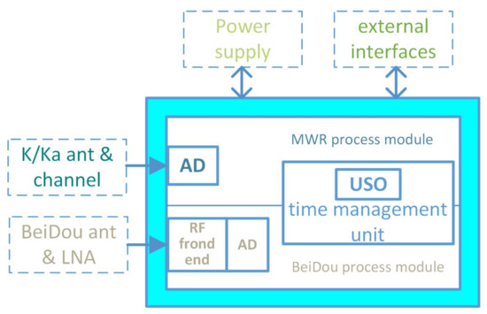 In order to achieve the accuracy of 0.1ns inter-satellite time synchronization required by MWR system, the BeiDou dual frequency receiver needs to be totally redesigned, with adaptability integrated within the MWR system. In the so-called integrated design, on the one hand, the BeiDou dual frequency receiver needs to share a unified frequency source with the MWR, taking the homologous USO as the frequency reference; on the other hand, it needs to design an integrated hardware platform for the digital processing of the MWR and the receiver, so as to realize the integrated signal processing and eliminate the errors caused by the common channels. The signal processing hardware platform mainly consists of MWR measurement signal processing, BeiDou signal processing, time management unit, and external interfaces [26].